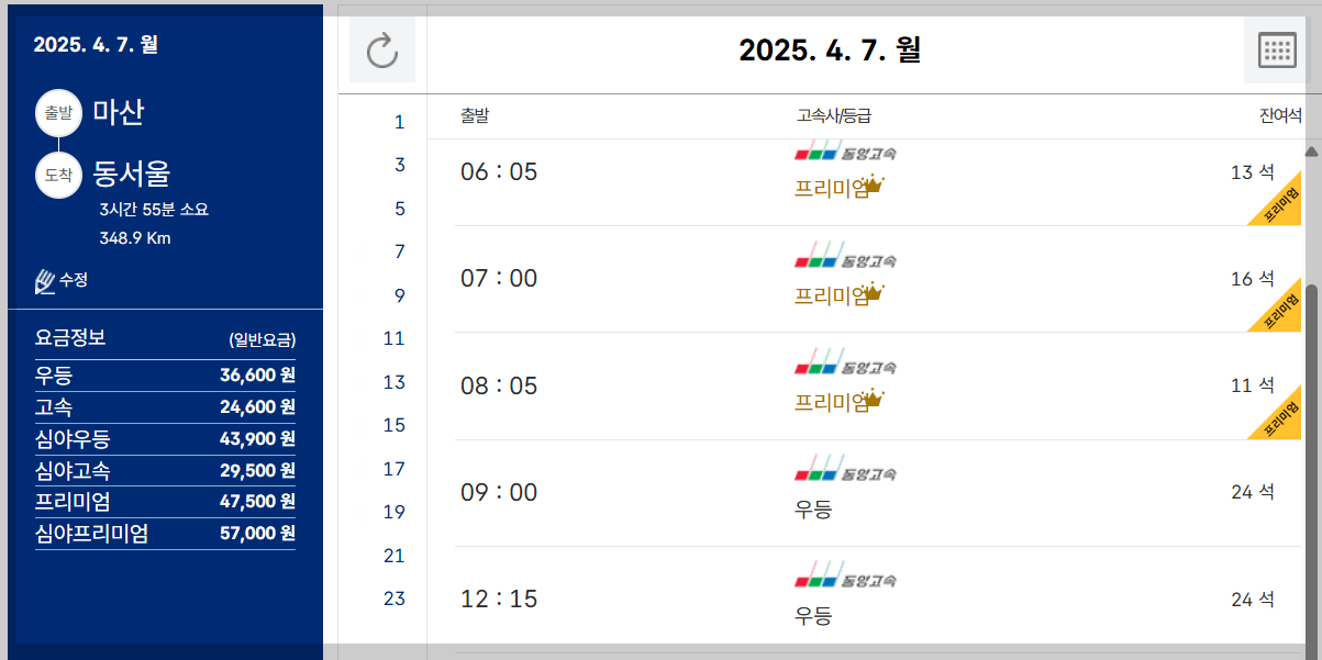 | 마산 → 서울 (남부/센트럴) | 약 4~4시간 30분 | 가장 인기 많은 장거리 노선 |